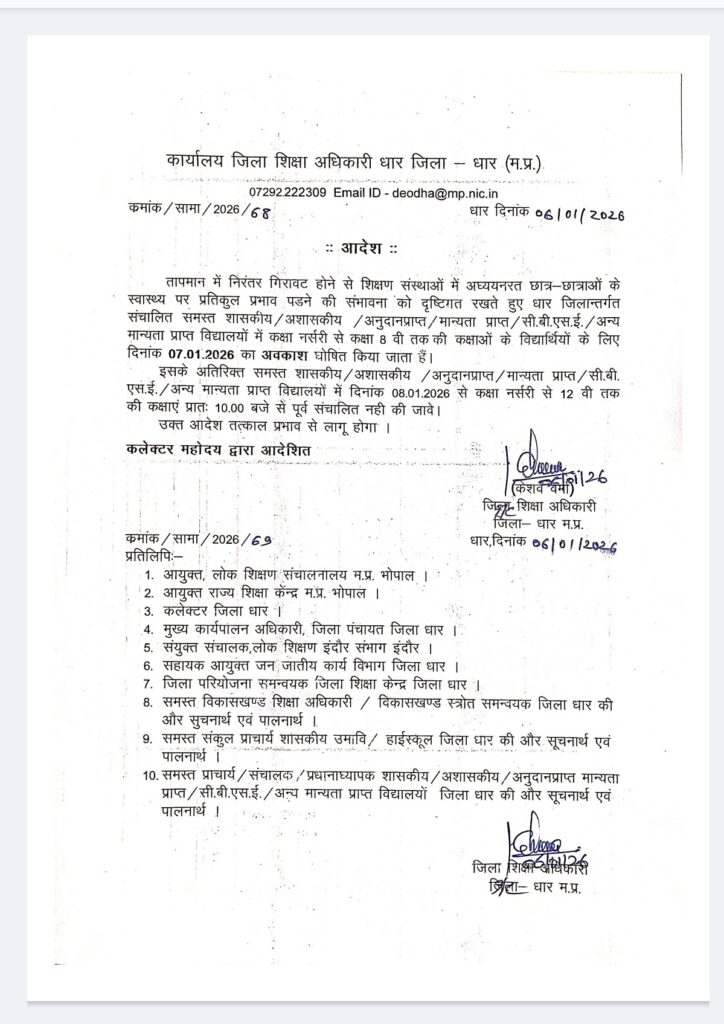 धार, 6 जनवरी 2026।* कलेक्टर श्री प्रियंक मिश्रा के आदेशानुसार जिला शिक्षा अधिकारी धार द्वारा तापमान में निरंतर गिरावट एवं शीत लहर के प्रभाव को दृष्टिगत रखते हुए जिले के शिक्षण संस्थानों में अध्ययनरत छात्र-छात्राओं के स्वास्थ्य पर प्रतिकूल प्रभाव की संभावना को ध्यान में रखते हुए कलेक्टर के निर्देशानुसार आदेश जारी किए गए हैं।