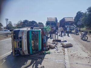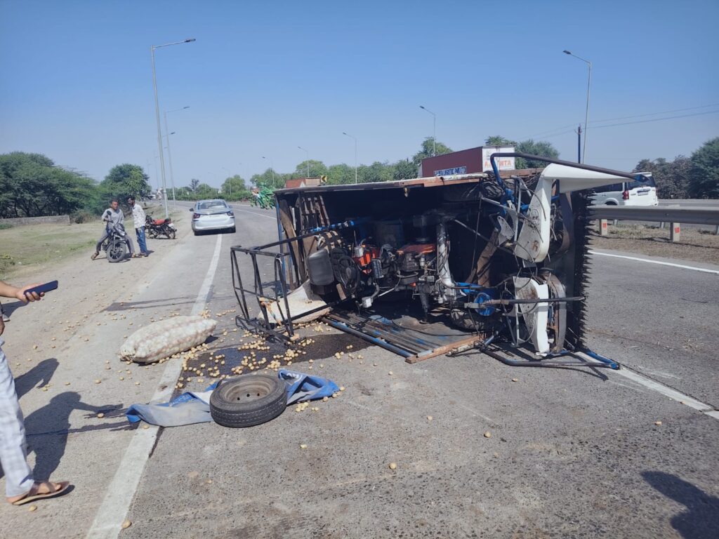 मोरटा एबी रोड जोड़ पर मैजिक वाहन पलटा, गेहूं काटने की मशीन ले जाते समय हुआ एक्सीडेंट