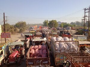 किशोर सिंह राजपूत, शाजापुर। कृषि उपज मंडी शाजापुर में गुरुवार सुबह बड़े पैमाने पर उपज की आवक हुई। प्याज की बोरियों से लदे वाहनों की लाइन एबी रोड पर लग गई। जिससे यातायात व्यवस्था प्रभावित हुई और कई वाहन चालक व वाहनों में सवार लोग परेशान होते दिखाई दिए। यहां आए दिन इस तरह के हालात बनते हैं। लेकिन ना तो प्रशासन इस और गंभीर दिखाई दे रहा है और ना ही मंडी प्रबंधन व यातायात पुलिस।